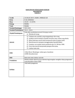 Latih Tubi Matematik Tahun 5 Bahagi Nilai Wang. 123 Penolakan panjang Standard Pembelajaran. RANCANGAN PENGAJARAN HARIAN MATEMATIK Mata Pelajaran.