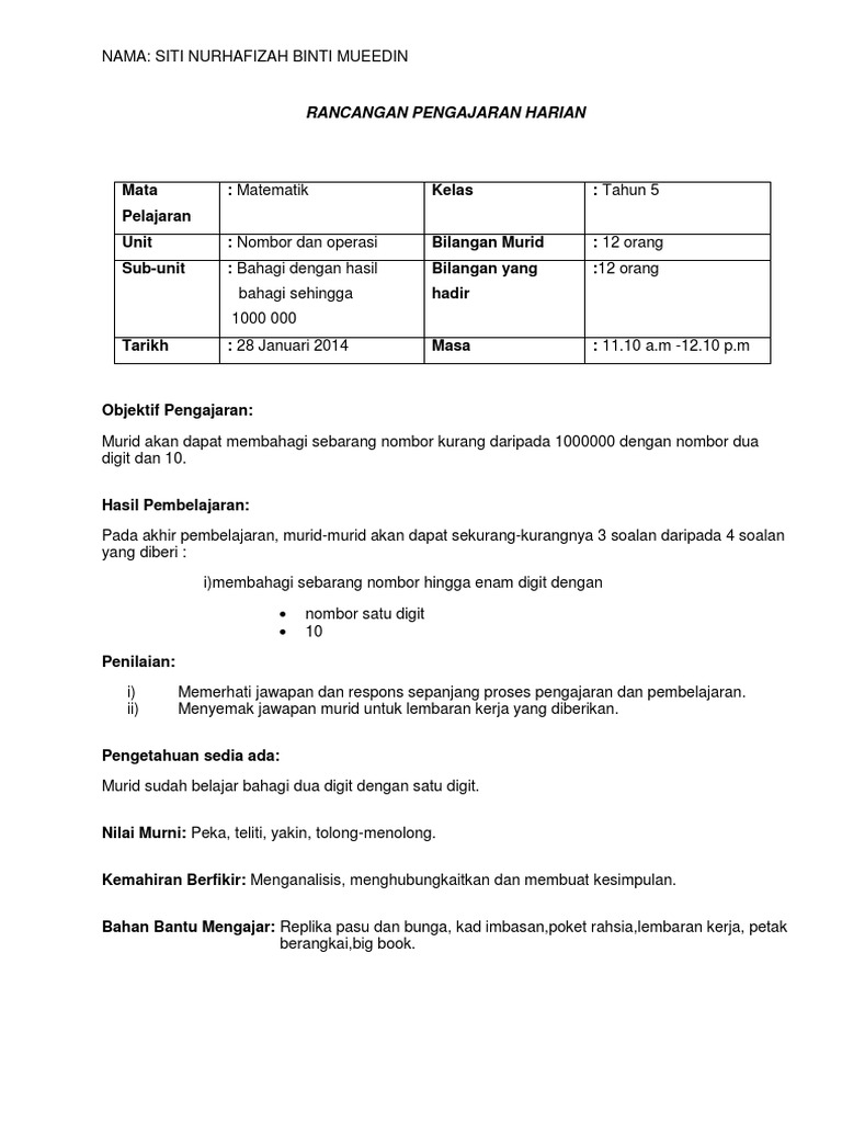 Rancangan Pengajaran Harian Bahagi Panjang Matematik Tahun 5 Pdf